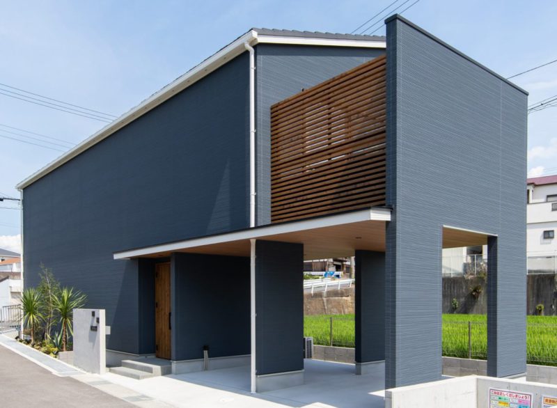 深みのあるブルーの外壁とルーバーバルコニーがある存在感のある外観