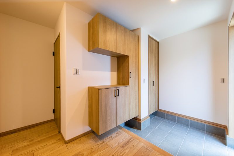 シューズBOXに加えて土間収納も設け、収納力抜群の玄関スペース。扉を閉めてスッキリ収納