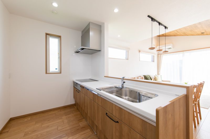 キッチン正面の大窓から視界が広がる気持ち良い間取り。床と合わせた木目のキッチンで一体感のあるLDKに