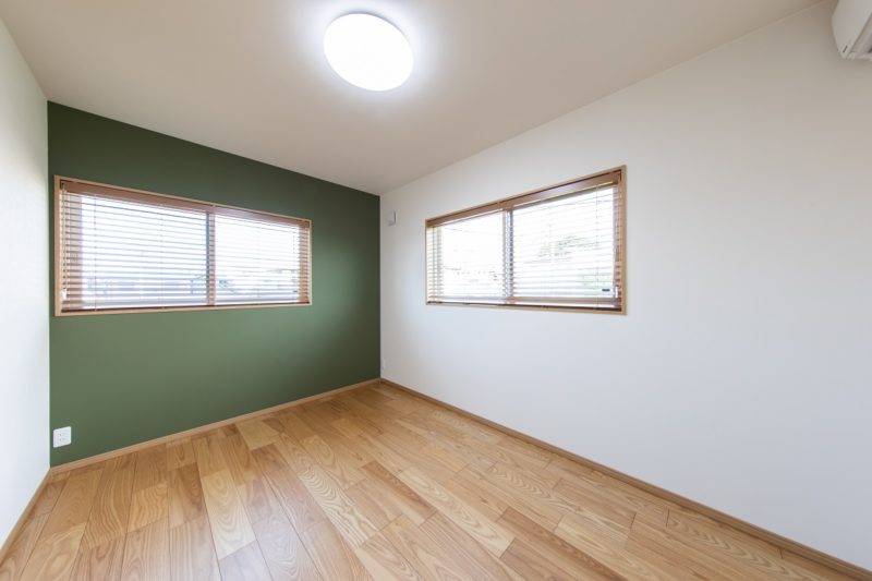 木目の床にグリーンのアクセントウォールでナチュラルなテイストに