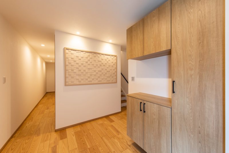 玄関正面壁にエコカラットタイルをアート作品の様に。壁の向こう側は階段下の物置スペース