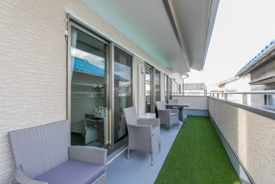 2階のバルコニーでコーヒーを楽しむご夫婦のお姿に大家族の暖かさを感じられるお家