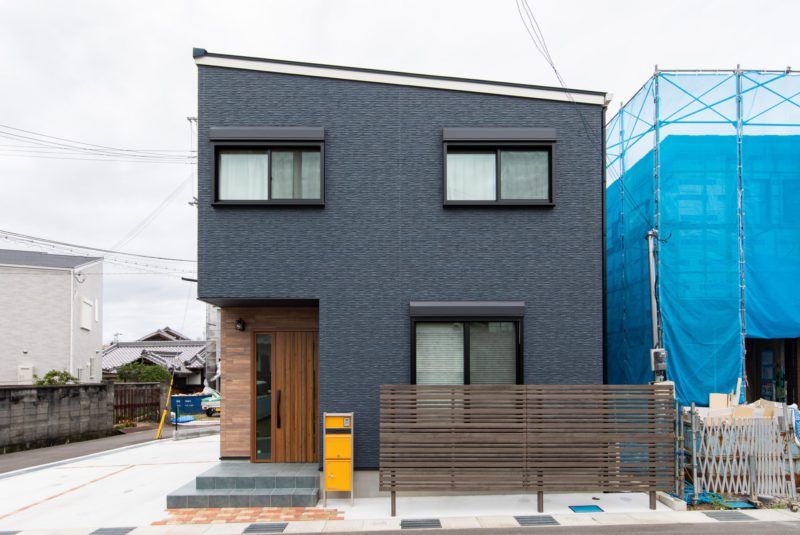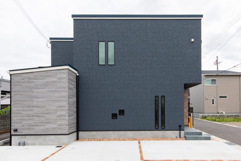 コンクリート調の壁材も組合せたお洒落な外観。プライバシーを守る形の窓に