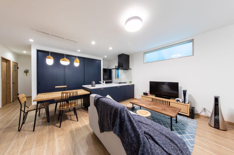 青いお洒落なリビングドアはPanasonicの「クラフトレーベル」
