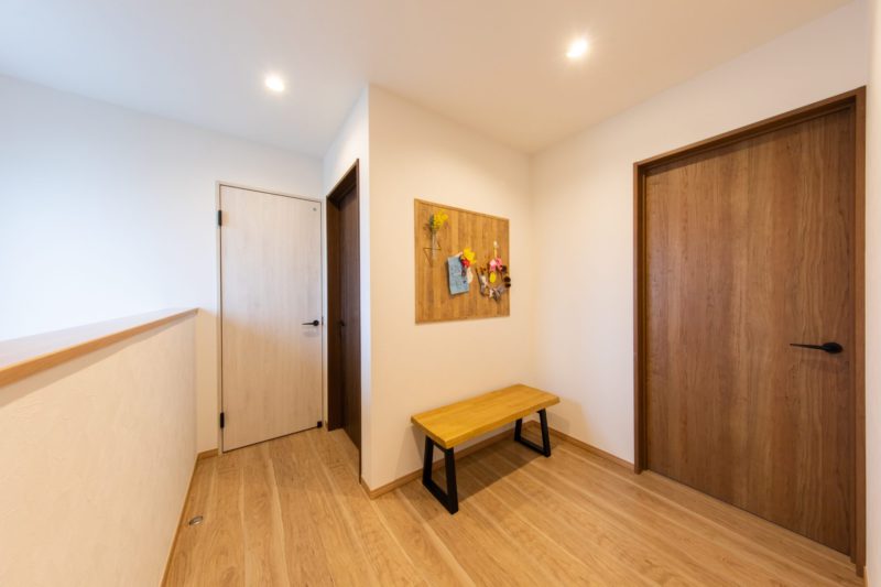 1階に収納スペースを集めて2階ホールは余裕を持たせた間取りに