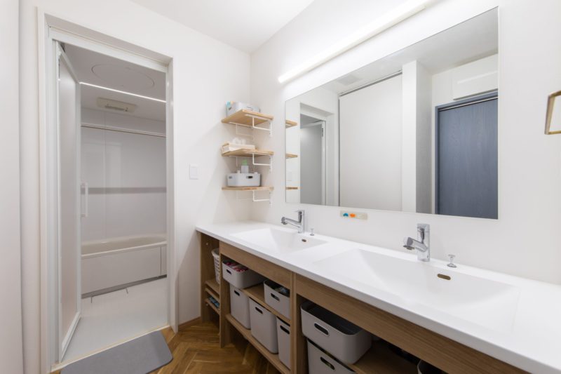 込み合うストレスを解消する為、親子で一緒につかえるようにと2ボウルの洗面台を設置