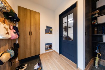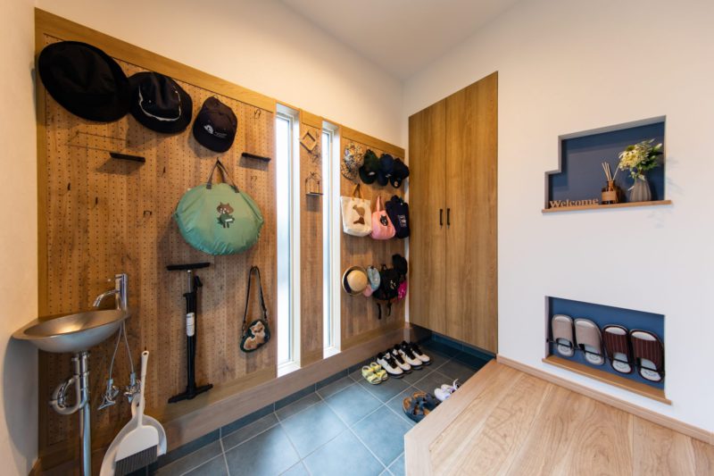 玄関のホールを斜めにして最小限にとどめ、その分土間を広げた間取りに。外遊びの道具や手をすぐ洗えるように洗いボールを土間に設置