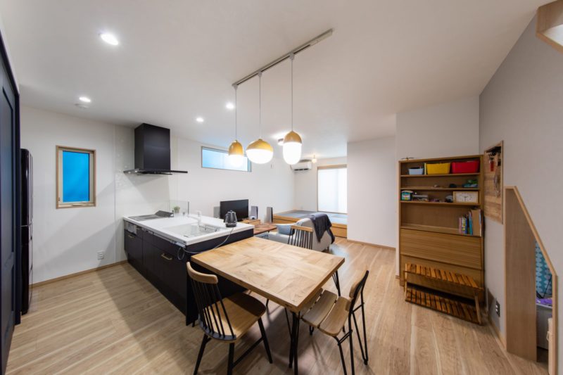 キッチンからLD、畳コーナー、階段下のキッズスペースと全体が一望でき家事と見守りが両立
