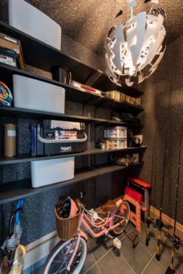 お子様の成長で変わる持ち物も収納する物に合わせられる可動棚で対応。汚れが目立たないように黒地に水玉模様のクロスを選択