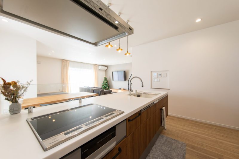 キッチンに居ながらリビングの家族を見守れるようにとフラットな天板スタイルのキッチンをご選択
