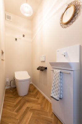 ヘリボーン調のフロア材がオシャレなタンクレストイレルーム