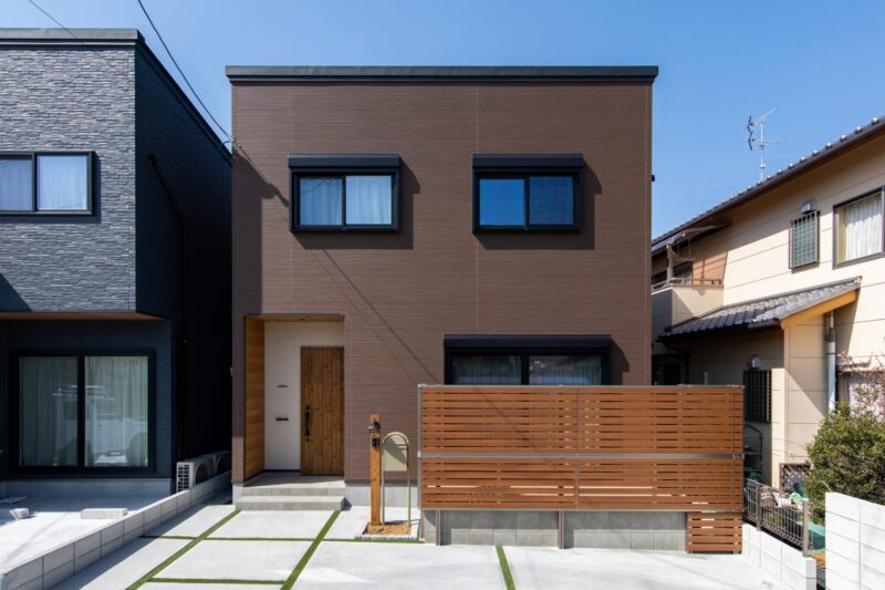 木のお家を思わせるオーク色の外壁にブラックカラーがアクセントの外観