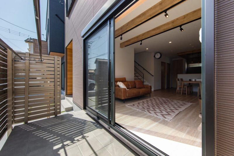 外からの目線をルーバーで目隠しされたプライバシーを確保したタイルデッキはリビングから一続きの使い勝手抜群な動線に