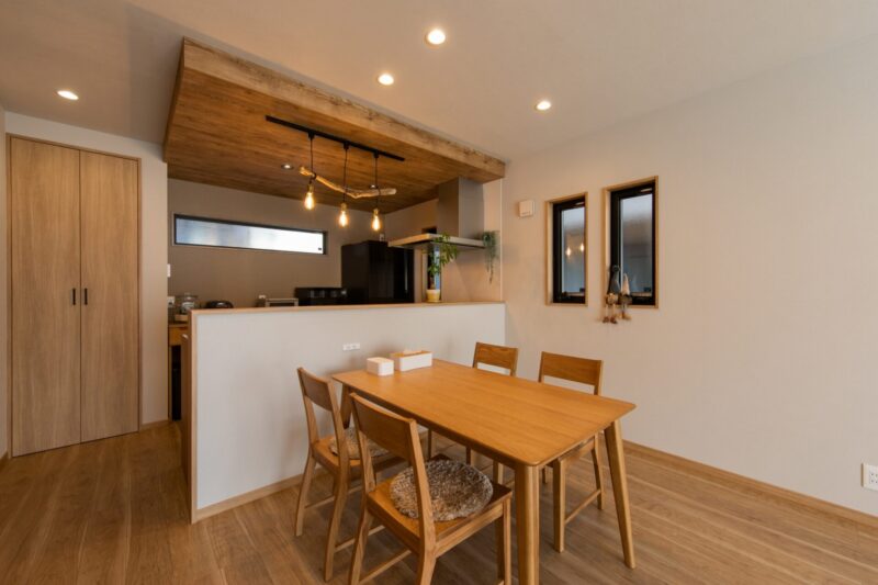 テクノストラクチャー工法で天井高を保ちつつ木目の下がり天井がオシャレをアクセントにしたキッチン。腰壁の目隠し効果ですっきりとしたダイニングに仕上がりました