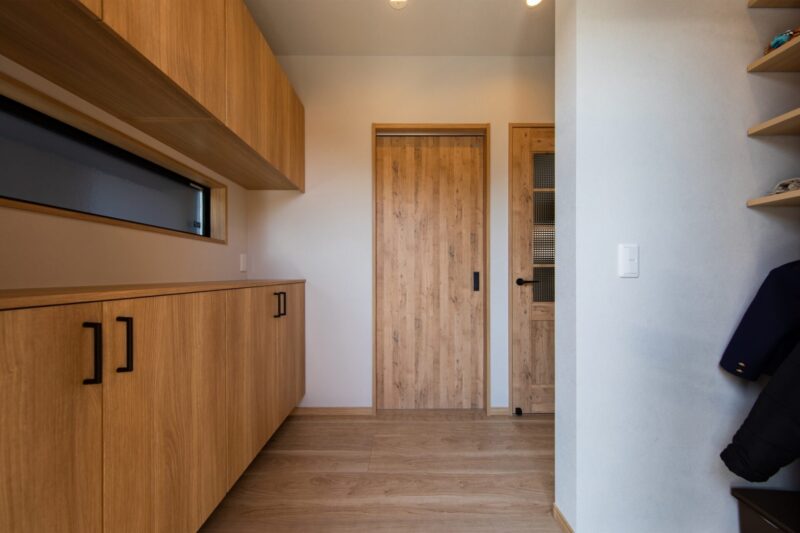 暖かさと広さを強調した収納、扉、床、全て木目で統一された玄関