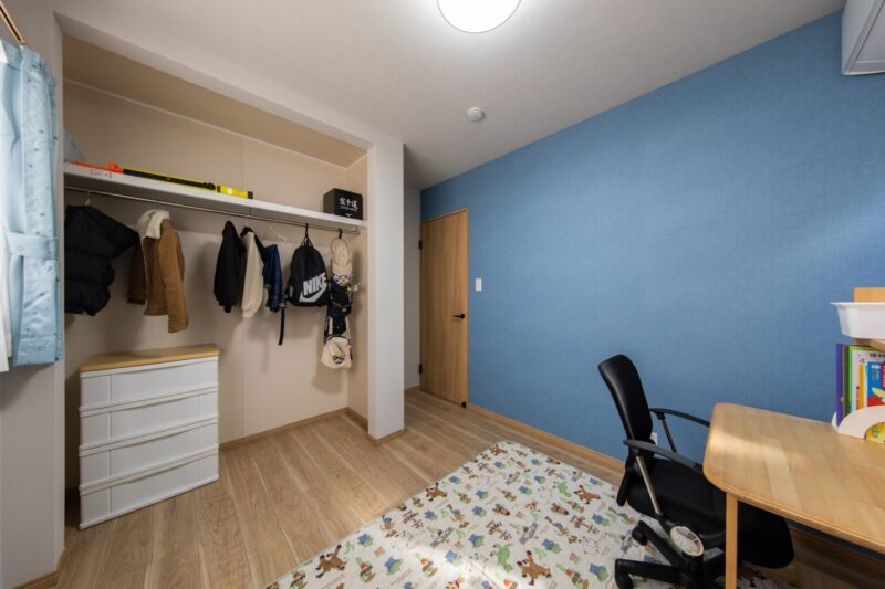 大空を感じさせるブルーのクロスを使った子供部屋。大きなクローゼットだから、お子様自身ですっきりお片付け可能