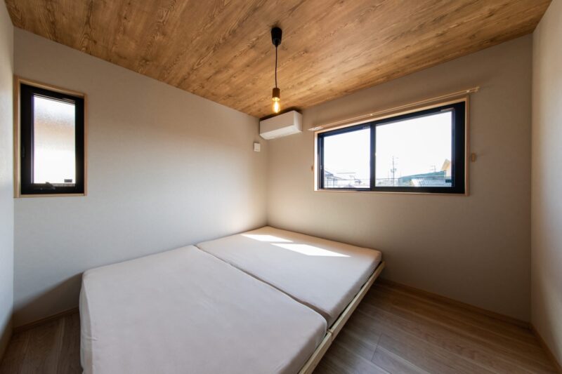 天井を木目にしたベットに寝転がって天井を見上げると森の中に居るようなゆったりとした雰囲気の寝室。照明をペンダントライトにして自然の雰囲気UP