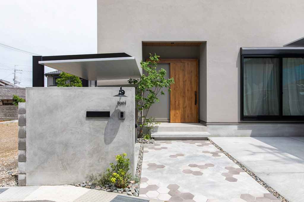 グレージュの塗上げの外壁正面にモルタルと黒いアイアンを組み合わせた外構