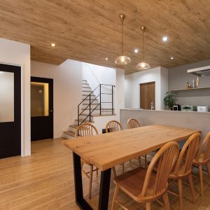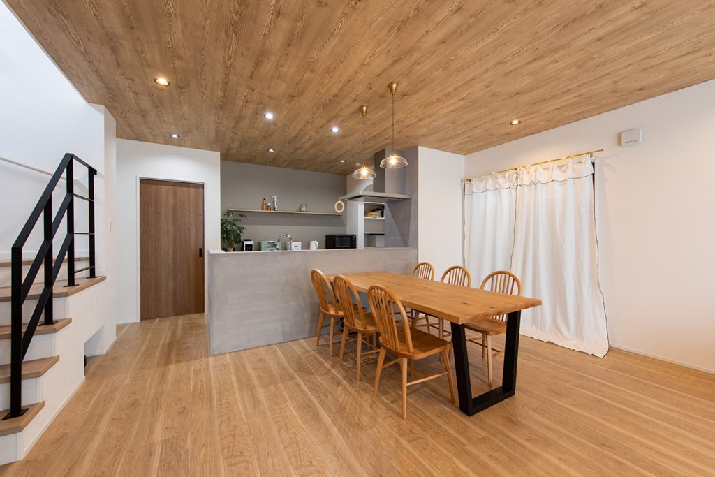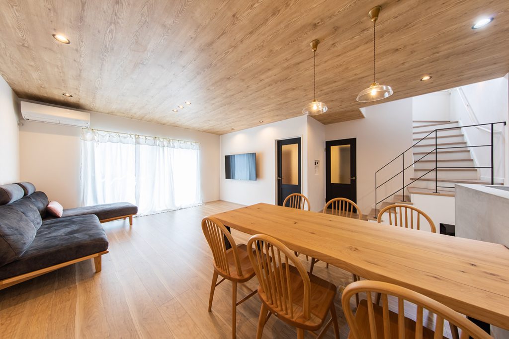 床と天井に同一の木目を合わせる事でより広さが強調されました