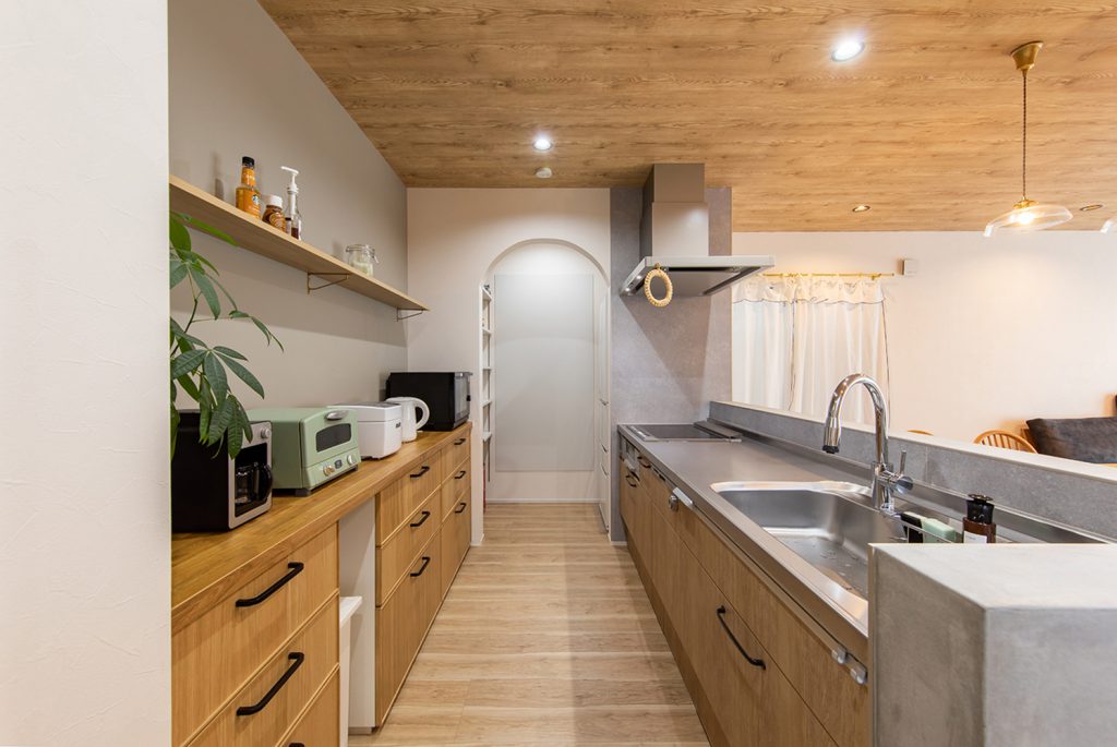 アーチ状の壁の向こうは見せたくない家電を配置してお部屋と調和のとれたキッチン
