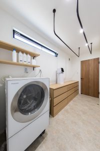 洗濯したらそのまま干せる脱衣室ランドリールーム。ウォークインクローゼットもすぐ奥に