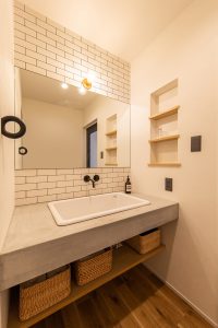 モルタルの洗面台にスクエア型のシンク。サブウェイタイル張りの壁でこだわりの洗面室に