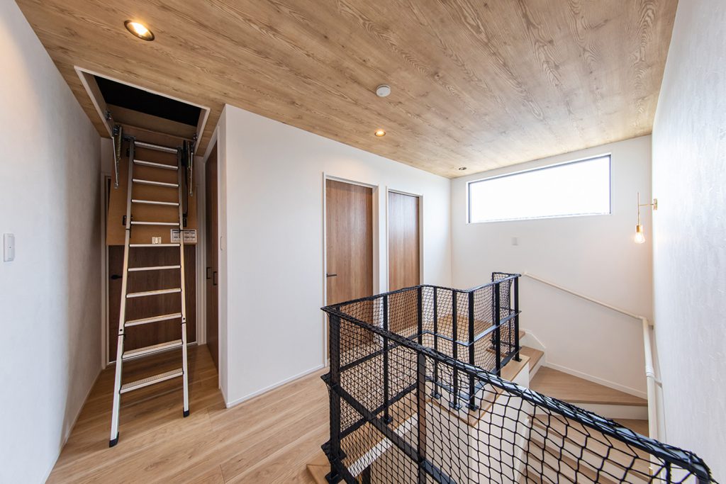 高い位置に窓をとる事で明るい階段ホールに。小屋根裏収納が便利