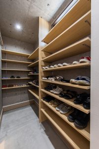 高さ調整可能な棚板でどんな靴も並べて収納できる土間収納。上部の窓で明るさを取り入れる工夫も